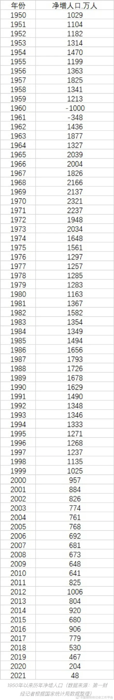 根據國家統計局數據對1949年以來歷年人口凈增量梳理,2021年凈增人口數量創下了近60年來(1962年以來)的新低了。