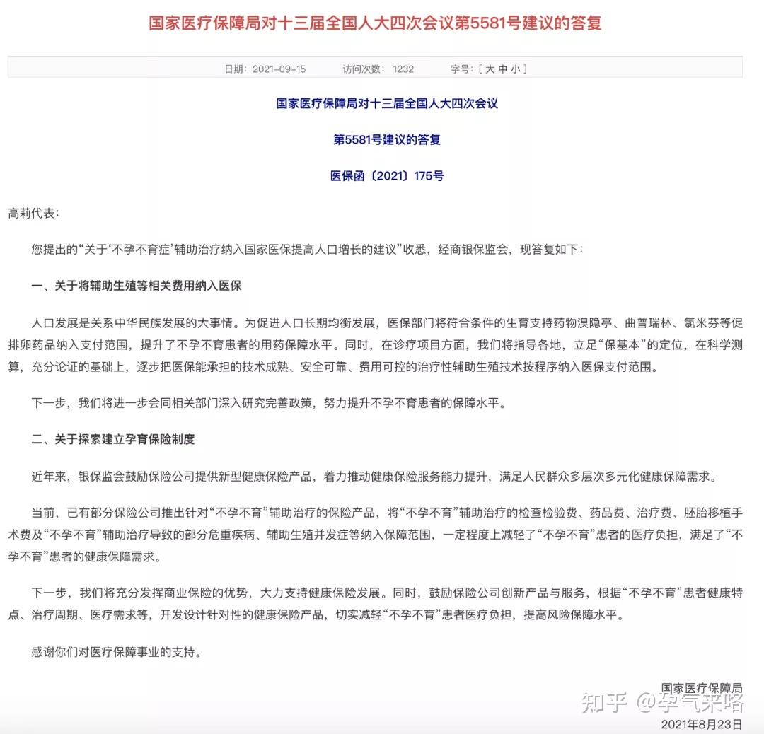 5月底,國家三胎政策開放。關(guān)于生育的討論,越來越多。9月15號(hào),國家醫(yī)療保障局網(wǎng)站發(fā)布的《國家醫(yī)療保障局對(duì)十三屆全國人大四次會(huì)議第5581號(hào)建議的答復(fù)》(以下簡(jiǎn)稱《答復(fù)》),公布了國家醫(yī)保局經(jīng)商銀保監(jiān)會(huì)答復(fù)全國人大代表高莉提出的“關(guān)于‘不孕不育癥’輔助治療納入國家醫(yī)保提高人口增長的建議”的具體內(nèi)容。