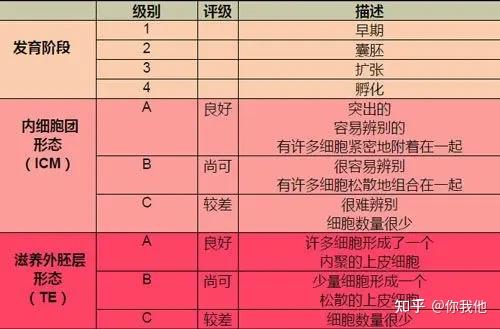 從以上這些數字結合起來就能夠大致知道囊胚的形態,比如說評分為“4AB”的囊胚,“4”表示囊胚處于4期,“A”表示囊胚的內細胞團評級,“B”表示囊胚的滋養細胞層評級。