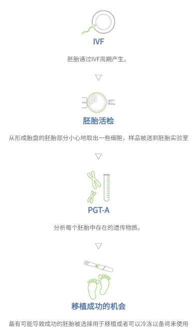 左側為正常染色體,右側為非整倍體PGT-A的作用① 提高妊娠率② 減少流產的風險③ 轉移單個胚胎更有信心,避免與雙胞胎或三胞胎懷孕相關的健康風險④ 減少妊娠所需的IVF周期數,可能減少懷孕時間和額外周期的費用PGT-A的過程PGT-A廣泛用于IVF治療中。也是我們常常稱為的第三代試管嬰兒以下是它的工作原理: