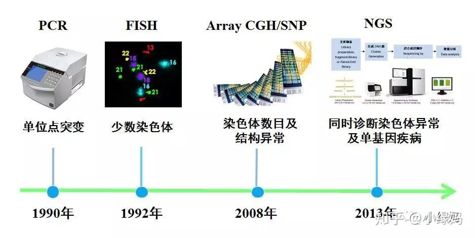 由最初的PCR僅能檢測單位點的突變,發展到FISH技術,可以檢測少數染色體,后來又出現芯片技術,可以檢測所有染色的數目及結構異常,到目前新興的二代測序技術,可同時進行染色體異常及單基因疾病的診斷。