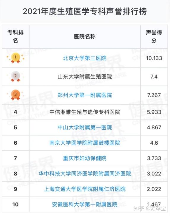 目前國內有五百多家醫院能做試管,包括做三代試管嬰兒的,其中各項專科聲譽排名前十的醫療機構有: