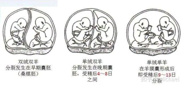 單卵雙胎約占雙胎妊娠的3/1,是一個受精卵分裂成兩個受精卵并成功妊娠,根據分裂發生時間的不同,主要分為三種情況。