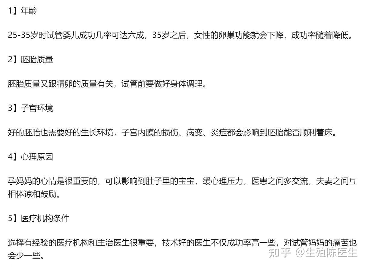 影響試管成功率的因素很多,主要還是代試的醫個人的身體素質(精卵質量,女性子宮環境等)和年齡(23-35歲之間)比較關鍵: